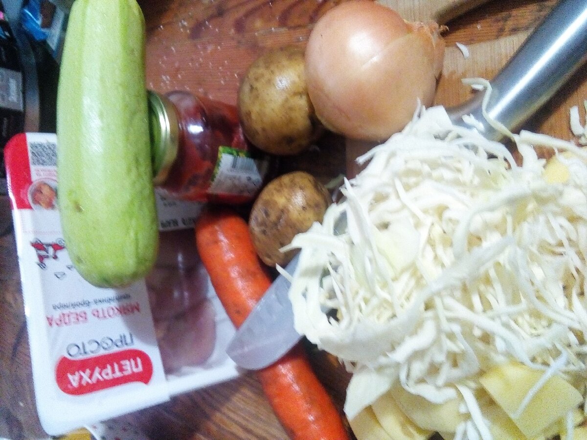 Рагу — очень удобное блюдо. Оно не требует гарнира и иногда способно заменить не только горячее, а ещё и суп. При этом приготовление не требует особых кулинарных навыков. Даже ингредиенты можно менять в зависимости от вкусовых предпочтений и содержимого холодильника. Для приготовления сегодняшнего рагу были использованы следующие продукты: Для начала моем и чистим все овощи. Далее приступаем к их измельчению. Не забываем включить мультиварку в режим жарки и налить на дно чаши немного растительного масла. Измельчённый лук отправляем в чашу. Спустя минуту добавляем к луку морковь, нарезанную не слишком тонкими полукружиями. Как только лук станет прозрачным, добавляем к зажарке курицу. Следом идёт капуста и перец. Не забываем про кабачок. Теперь пришёл черёд картофеля. Осталось добавить зелёный горошек, томатную пасту, специи, соевый соус, соль и укроп. Переключаем мультиварку в режим тушения, выставив время приготовления — 1 час. Добавляем воды, чтобы она чуть покрывала овощи и курицу.