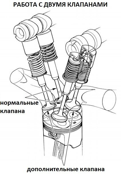 Мотоцикл Honda CB 400 VTEC I оснащен системой H-VTEC. Когда частота вращения двигателя ниже 6300 об / мин на 1-5-й передаче и ниже 6750 об / мин на 6-й передаче, работают только два клапана в каждом цилиндре (клапана VTEC не работают). На низких и средних оборотах двигатель работает как двигатель с 2 клапанами на цилиндр (рис.1). Рис.1 Когда частота вращения двигателя превышает 6300 об / мин на 1-5-й передаче и 6750 об / мин на 6-й передаче, все четыре клапана в каждом цилиндре работают, и двигатель работает с 4 клапанами на цилиндр (рис.2). Эта система VTEC позволяет повысить производительность двигателя и экономию топлива, а также снизить шум двигателя и вредные выбросы выхлопных газов. Рис.2 Дополнительные клапана начинают работать при следующих условиях (рис.3): - выключен датчик подножки; - температура двигателя больше 30°С; - частота вращения двигателя превышает 6300 об / мин на 1-5-й передаче и 6750 об / мин на 6-й передаче. При соблюдени