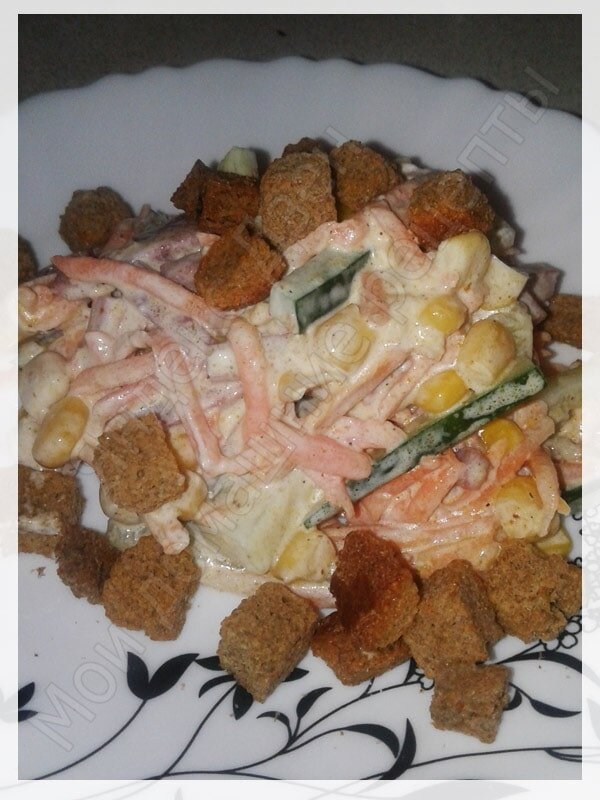 Очень вкусный и простой в приготовлении салат, который станет украшением Вашего праздничного стола. Приготовить его можно буквально за 15 минут, если под рукой есть все ингредиенты. Для салата потребуется: Шаг 1. Огурец режем соломкой и отправляем в миску, в которой будем перемешивать салат. Шаг 2. Колбасу тоже режем соломкой и кладем в миску. Шаг 3. С кукурузы сливаем рассол и добавляем ее в салат. Шаг 4. Корейскую морковь откидываем на дуршлаг, чтобы удалить жидкость и кладем в чашку. Шаг 5. Немного солим и перемешиваем салат. Шаг 6. Заправляем наш салат майонезом и перемешиваем. Перед подачей на стол посыпаем салат сухариками. Приятного аппетита! Если Вам нравится рецепт - ставьте пальчик вверх. Пишите вопросы в комментариях. Подписывайтесь на канал, чтобы не пропустить следующий рецепт. Попробуйте другие салаты: => Оливье => Морковный салат с грецким орехом => Королевский салат => Салат из фасоли => Салат Трио До скорой вкусной встречи:)