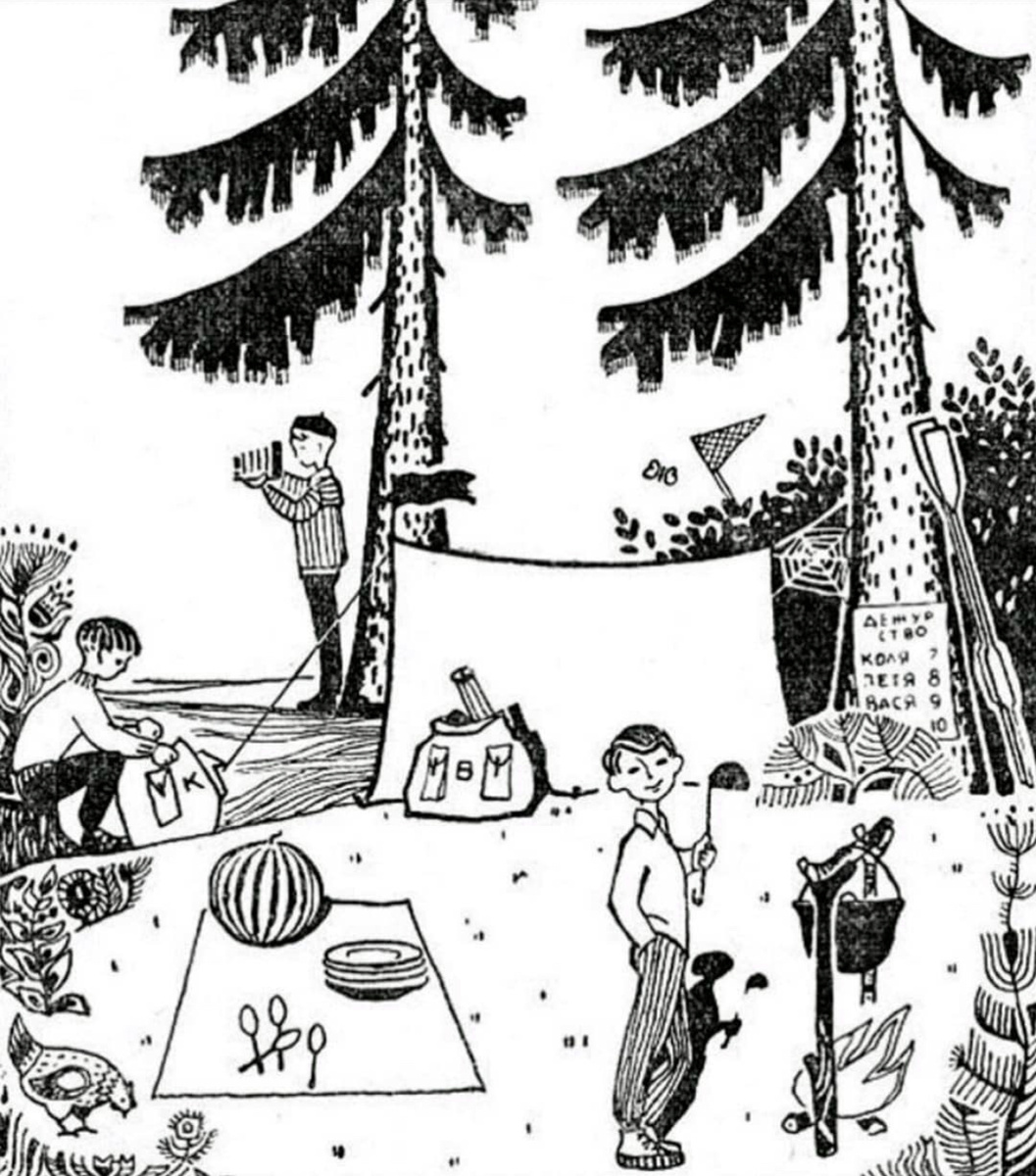 Посмотрите на эту картинку и ответьте на вопросы: 1️⃣ Сколько человек живёт на данный момент в этом лагере? 2️⃣ Когда они приехали (сегодня или несколько дней назад)? 3️⃣ На чём приехали туристы? 4️⃣ Далеко ли находится лагерь от ближайшего населённого пункта? 5️⃣ Откуда дует ветер: с юга или с севера? 6️⃣ Какое время суток изображено? 7️⃣ Куда делся Шура? 8️⃣ Кто вчера дежурил (имя)? 9️⃣ Какое число изображено (день, месяц)? Ответы смотри в конце поста⬇️⬇️⬇️ 🔹 🔹 🔹 🔹 🔹 🔹 🔹 🔹 🔹 🔹 🔹 🔹 🔹 🔹 🔹 🔹 🔹 Ответы: 1️⃣ 4 человека. 4 столовых прибора, 4 имени в списке дежурств. 2️⃣Несеолько дней назад, между палаткой и деревом уже появилась паутина. 3️⃣ На лодке. Видите вёсла около дерева? 4️⃣ Недалеко. В левом нижнем углу курица, значит, недалеко какой-то населённый пункт. 5️⃣ Ветер дует с юга. Определяем по флажку на палатке и еловым веткам, где они гуще, там юг. 6️⃣ Утро. Где юг мы уже поняли, а значит, остальные части света тоже найдём. Тени от предметов падают на запад, значит
