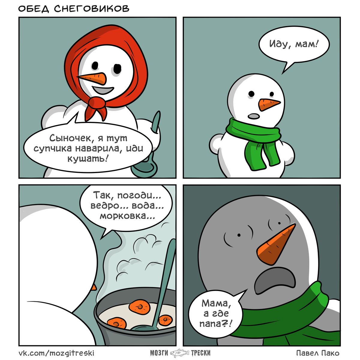Конечно же, я не мог оставить вас без собственных новогодних комиксов, которых как раз накопилось на целую подборку. К тому же, я посчитал, что проводить год статьей именно с моими работами будет символичнее всего - ведь изначально этот блог был посвящен как раз-таки только им. В общем, надеюсь, что вам понравится. Начнем мы, пожалуй, с комиксов, которые посвящены не конкретно Новому году, а любимой многими зимней забаве - лепке снеговиков. А если уж быть еще конкретнее - самим снеговикам. Представьте, что снеговики могли бы жить собственной жизнью - какой бы эта жизнь могла бы быть? Как мне кажется, как минимум, в ней появилось бы множество странностей и противоречий. К примеру, чем снеговики могли бы питаться? И во что они стали бы верить? Давайте попробуем пофантазировать. Новый год и Дед Мороз - это два совершенно неотрывных друг от друга понятия. И если у людей еще могут быть сомнения по поводу того, существует ли на самом деле тот самый праздничный дедушка, то вот, к примеру, у б