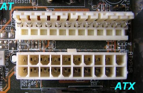 Блок питания компьютера подает на материнскую плату через разъем питания стандарта AT или ATX набор напряжений. Это +5v; -5v; +12v; -12v; и (на старых AT отсутствует) +3.3v; -3.3v; На фото слева плата с двумя вариантами разъемов. Справа на рисунках распиновки этих разъемов ( обратите внимание вид рисунка сверху - соответствует фото ). Измерять напряжение удобно если ваш тестер имеет тоненький кончик щупа (+), желательно толщиной с иголку, и минус (-) с зажимом типа - крокодильчик. Минус подключаем на массу материнской платы, устанавливаем предел измерения тестера вольт на 20 (постоянку) и осторожненько начинаем исследования... Фрагмент материнской платы с поддержкой двух видов форм-факторов: