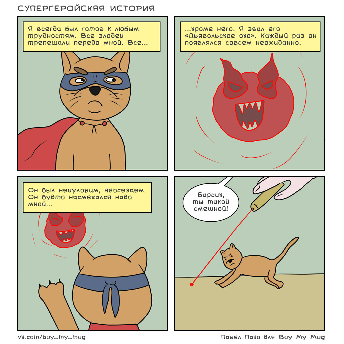 В наше время кошки - настоящие короли интернета. Каждый день в сети появляется просто огромное количество смешных или милых видео про этих пушистых питомцев и их уморительные проделки. А еще про них пишут книги, снимают мультфильмы и, конечно же, рисуют комиксы. Думаю, что вы и сами натыкались на множество авторов, которые создают забавные зарисовки про кошек. И я в этом плане не исключение. Но так как комиксов о кошачьем домашнем быте и так полно, как правило, в своих комиксах про кошек я старался пофантазировать на более отвлеченные темы. К примеру, если бы появился кот-супергерой, то кто стал бы его самым главным злодеем? Или какие отношения у кошек со Смертью - той, что ходит с косой и в балахоне? А также кошки и вторжения инопланетян, кошки, как божественные сущности и другие неожиданные мысли, которые пришли мне в голову во время рабочего процесса. Некоторые из комиксов в этой статье я рисовал на заказ для одного уютного магазина кружек с авторскими иллюстрациями. Задача была про