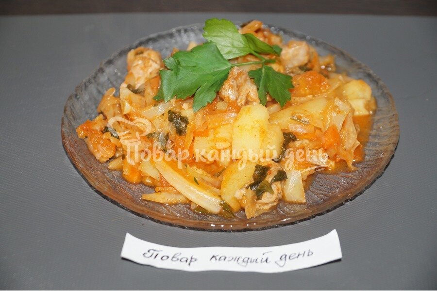 Тушеная капуста с картошкой и мясом не требует особых навыков кулинарии. Этот быстрый и простой рецепт очень понравится любой хозяйке. Готовится очень легко, получается вкусным и полезным. В капусте содержится очень много полезных веществ, поэтому она необходима в каждодневном рационе. Существует множество вариаций приготовления капусты: квашенная, тушеная, свежая. Мы ее добавляем в огромное количество блюд, будь то пирожки, вкуснейший борщ, или салат. В данном рецепте - капуста является одним из главных ингредиентов. Время приготовления: 1 час. Количество порций: В среднем, получается, примерно, 5-6 порций на это количество ингредиентов. Готовится: на плите Ингредиенты: Капуста белокочанная -300 грамм Картофель- 400 грамм Мясо (свинина или говядина, на Ваш вкус) -300 грамм Помидоры-1 штука Морковь-1 штука Томатная паста- 2 столовых ложки Лук репчатый – 1 штука Чеснок - по вкусу Масло растительное или оливковое – пару ст