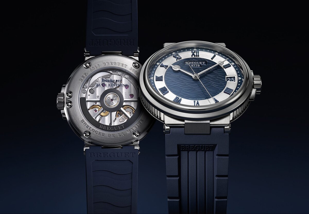 В списке брендов, которые в последние несколько лет выпускали модели с приставкой Bucherer Blue Editions, пополнение. Мужественное сочетание холодного титана и темно синего цвета явно было выражено в новой модели от Breguet . Часы представлены в рамках коллекции Marine. Модель получила легкий 40-миллиметровый корпус из титана с матовой и полированной отделкой. Устойчивый к воздуху и коррозии материал дополняет темно синий циферблат с узором ручной роботы гильоше в виде волн. Форма стрелок , наряду с более крупным рифлением корпусного кольца и центральными креплениями ремешка стала одной из отличительных черт модели Marine Équation Marchante 5887, которая была представлена в 2017 году, и серии новинок в коллекции Marine, представленных годом позже. Также одной из новых черт линейки Marine является заводная головка с вензелем в виде буквы «В» и упорами в форме волны. Некоторые детали, подчеркивающие заданную морскую тему, видны не сразу. По задумке разработчиков ротор имеет форму штур