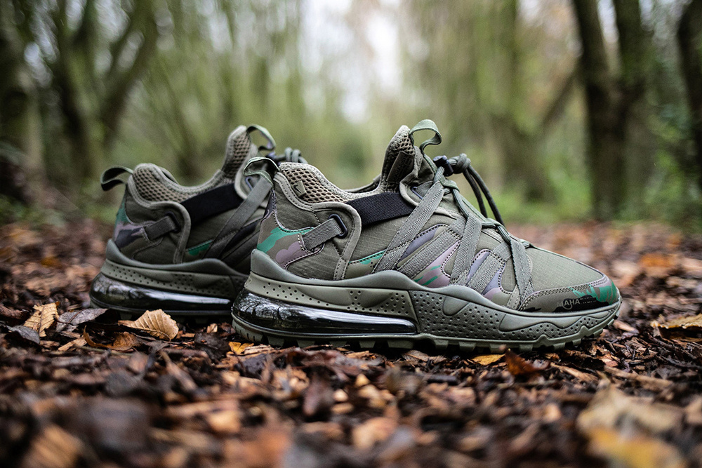 Из этой же ткани сделаны Air Max 270 Bowfin Premium. Выполненные в черном и зеленом цветовых решениях, они выделяются фирменным камуфляжем maharishi Bonsai, частично покрывающим верх кроссовок, элементом из светоотражающего материала 3M Reflective в районе пятки, лентой с текстом, а также стелькой с надписью Nike by maharishi – в данном случае обошлось без «купюр», логотипы и так скрыты от посторонних глаз.