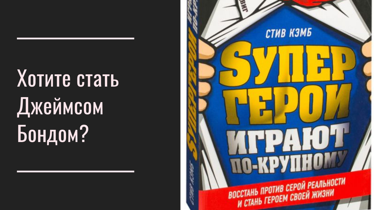 Всем привет. С вами Наталья Пэ или Эм и “Семья на миллион” Сегодняшний обзор о книге Стива Кэмба “Супергерои играют по-крупному. Восстань против серой реальности и стань героем своей жизни.” “Как сказал Бен Франклин, “некоторые умирают в 25, а хоронят их только в 75. Я уже слышала об этом парне раньше и даже видела его видео, поэтому заинтересовалась этой книгой. Он мечтал прожить неделю как Джеймс Бонд и сделал это! Из тихого парня превратился в экстремала. Я увлеклась его идеей превратить нашу жизнь в любимое кино, книгу или видеоигру и составила несколько квестов: "Кулинарный квест", где я планирую каждую неделю готовить новое блюдо из бразильской кухни, используя незнакомый для меня продукт (а тут их огромное количество!); Квест “Счастливая семья”, где мы с мужем проводим один день за увлекательным занятием. В списке - поход в театр, аквариум в Рио и т.д. Мне очень понравилась его идея, где мы себя вознаграждаем за успешную тренировку не порцией мороженого, а тем, что ещё больше