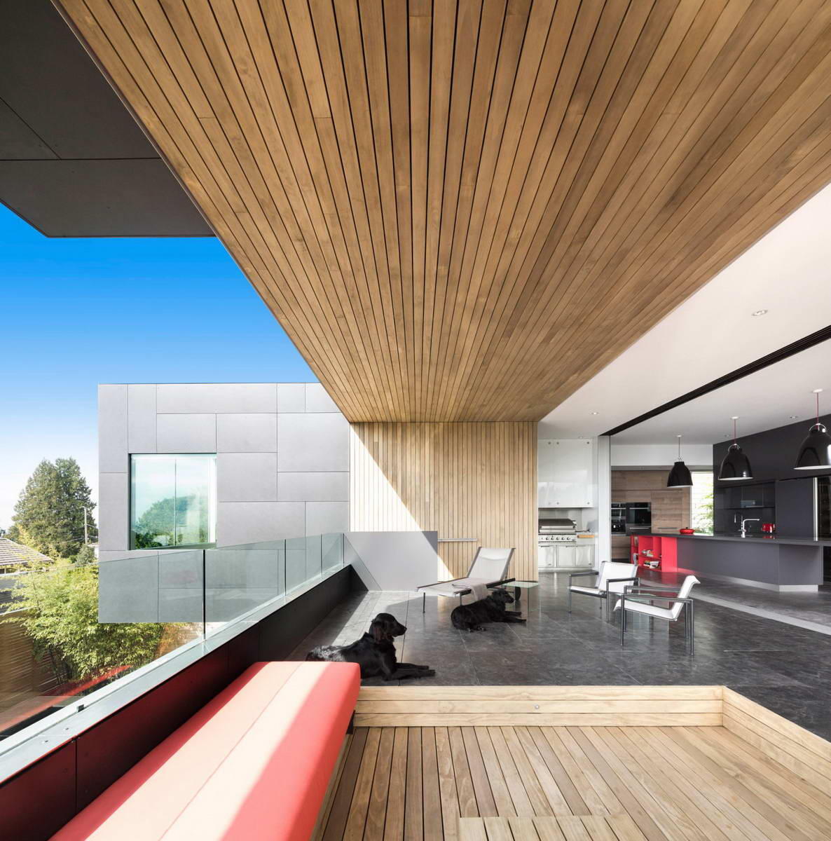 Этот модернистский дом построен для супружеской пары с тремя взрослыми детьми, которые запросили компактное и упрощенное жильё с прицелом на пенсию. Они искали место, в котором бы можно было соединить легкость квартиры с крытыми и открытыми площадками. Переезд из старого семейного дома, который был расположен на плоском участке, в круто наклонную местность создал возможность для светлого и открытого дома, расположенного высоко над землей. Первоначальное пожелание трёхэтажного дома было пересмотрено и принята схема с двумя этажами, которая, хотя и меньше по размеру в целом, создаст дом с более щедрыми внутренними объемами и большей архитектурной возможностью. Все элементы, необходимые для повседневной жизни, расположены на верхнем этаже, включая главную спальню, в то время как вторичные спальни, кабинет и комната отдыха расположены на нижнем этаже. Эта стратегия сводит к минимуму вертикальные перемещения внутри дома, устраняя один лестничный пролет. Размещение гаража на разделенном ур