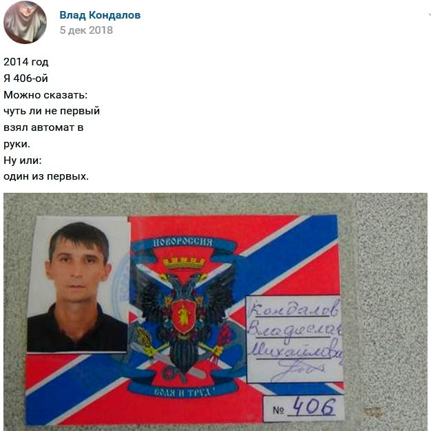Как помилованные Украиной оккупанты продолжают убивать украинцев на фронте Что происходит с пойманными террористами и оккупантами, воевавшими на Донбассе против Украины? Их отпускают, те возвращаются на фронт и продолжают убивать украинцев. Так, местный блогер “1й Антиреспубликанский” опубликовал в Twitter информацию про действующего российского наёмника, который одним из первых был незаконно переправлен в составе НВФ на Донбасс спецслужбами РФ. После задержания украинскими силовиками боевика отпустил суд, и тот вернулся воевать против Украины. Об этом далее по порядку. В 2014 году российские правоохранители предложили четырежды судимому уроженцу Новокуйбышевска (РФ) Владиславу Кондалову за новые документы с «чистой биографией» отправиться воевать на Донбасс. Имея за спиной среднее образование и «послужной список» из 16 лет заключения, Кондалов согласился. В том же году Кондалов покинул родной Новокуйбышевск и поехал в Украину — служить в рядах НВФ под руководством «атамана» Козици