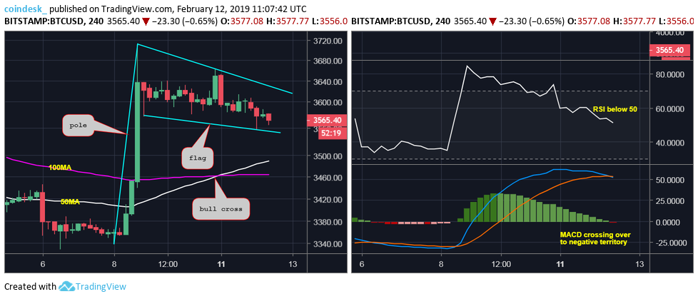 Биткоин отступил на 4% от трехнедельных максимумов, наблюдавшихся в пятницу, но, похоже, сформировал бычий флаг - модель бычьего продолжения - на 4-часовом графике. Движение выше 3630 долларов подтвердит прорыв флага и откроет двери для покорения 4'000 долларов. Откат биткоина от трехнедельных максимумов, достигнутых в пятницу, не означает, что ралли закончилось. Фиксация ниже нижней границы флага (в настоящее время на уровне $3'546 долларов США), ослабило бы краткосрочный бычий прогноз. Это, однако, выглядит маловероятным, так как путь наименьшего сопротивления находится на более высокой стороне, в соответствии с сильным прорывом падающего клина в пятницу. Вероятность краткосрочного ралли В настоящее время криптовалюта торгуется на Bitstamp по 3'560 долларов, после 4-процентной коррекции от трехнедельного максимума в 3'711 долларов, достигнутого 8 февраля. Формированию пятничного локального максимума предшествовали неоднократные неудачи с преодолением 50-дневной скользящей средней (M