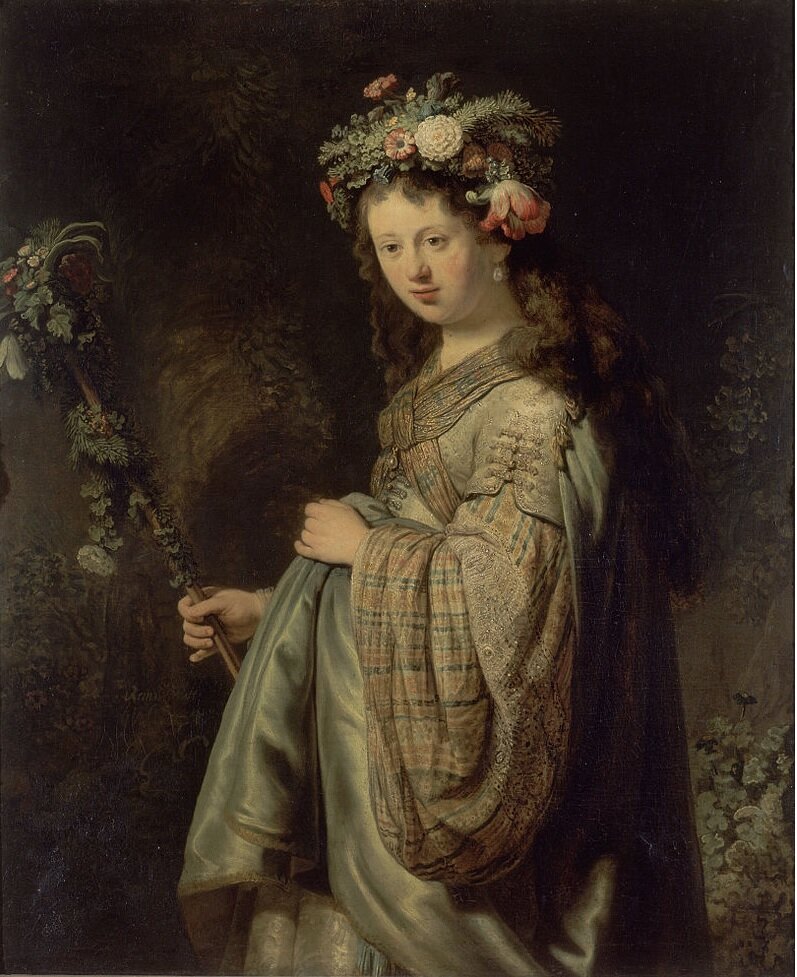 Изображение этой девушки в цветочном венке впечаталось в подкорку с самого детства. Не помню, где я ее увидела впервые - то ли это была почтовая марка из серии "Искусство", то ли репродукция в учебнике. Но я помню, что она сразу произвела на меня впечатление. От картины веяло такой нежностью... Потом, конечно, я узнала, что это портрет Саскии, жены Рембрандта ван Рейна, в образе Флоры. Он очень ее любил. Саския ван Эйленбюрх родилась в состоятельной семье и была младшей дочерью бургомистра города Леувардена. Рано лишилась матери, а потом и отца... Как-то она приехала в гости к кузине, жившей в Амстердаме. Саскии был тогда 21 год. А двоюродный брат Саскии, художник, занимался продажей картин и создал артель, объединившую его коллег по творчеству. В нее входил и молодой Рембрандт. Короче говоря, встреча произошла. Саския и Рембрандт полюбили друг друга и поженились. Художник просто обожал свою жену и постоянно изображал ее на своих полотнах в том или ином образе. Один из первых ее порт