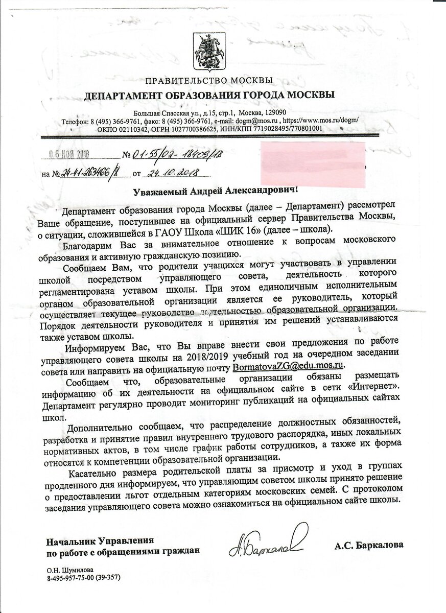 Рассмотрим письмо-ответ Департамента образования, которое я размещу ниже, тем более что большинство чиновников посчитали именно его «обстоятельным ответом» на мое обращение.