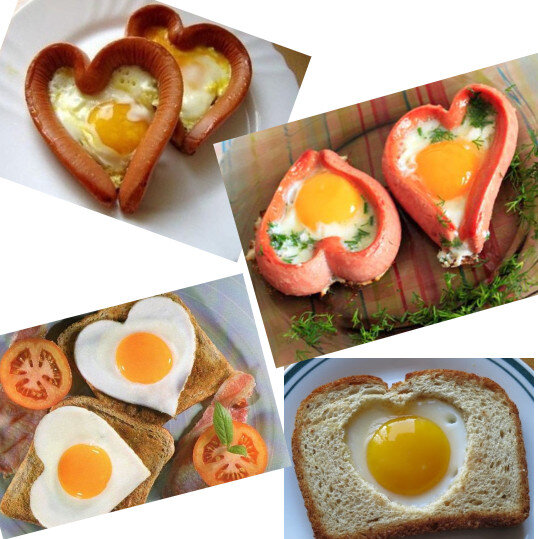 1. На завтрак - обычная яичница, поджаренная в формах сердечках, в тосте или обрамленная сосисками в виде сердца. Просто и мило. Можно пиццу в виде сердечка, котлеты, оладьи.