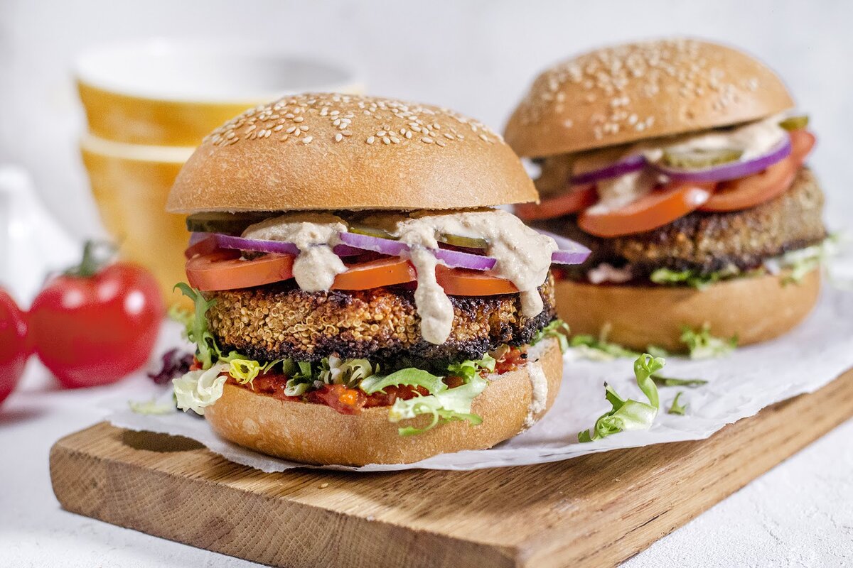 Веганские бургеры — явление распространенное. Они появились почти 40 лет назад! Родиной их считается Лондон. Именно там впервые был приготовлен бургер без мяса. Его изобретатели, наверное, озолотились. В первую же неделю продаж у них купили 2000 бургеров. Сегодня веджи-бургер обрел второе дыхание популярности. И на вашей кухне, в том числе. Булочки для бургеров 2 шт. Соевое молоко 50 мл Киноа 150 г Льняная мука 15 г Огурец соленый 80 г Аджика домашняя 130 г Тофу 100 г Паприка копченая ¼ ч.л. Лук красный 1 шт. Микс салата 30 г Помидоры 1-2 шт. Чеснок 1 зуб. Время приготовления 30-35 мин.