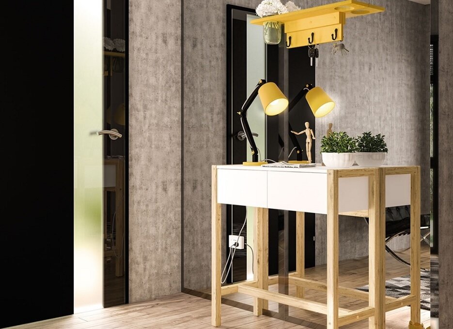 - вместо шкафов купе лучше использовать консоль и настенные вешалки с тумбами-пуфиками, внутри которых идеально прячется обувь.