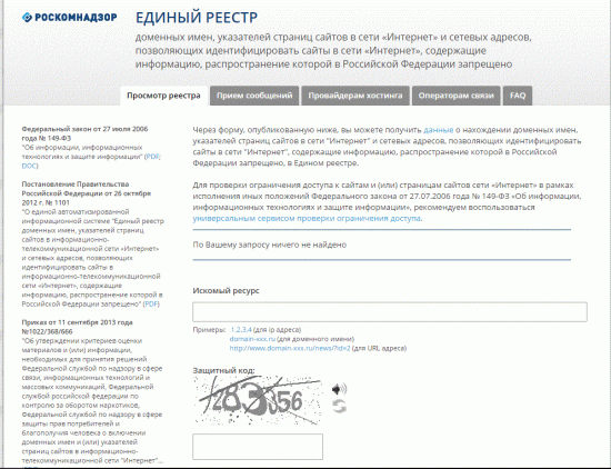 На основании Федерального закона от 27 июля 2006 г на территории Российской Федерации был организован единый реестр запрещенных сайтов. Сам реестр находится в видении Роскомнадзора, все сайты добавляются по судебному решению. Досудебное закрытие сайтов возможно после решения федерального органа при наличии детской порнографии или объявлений о привлечении несовершеннолетних в качестве исполнителей в мероприятиях порнографического характера; информации об изготовлении или получении наркотиков, психотропных веществ и их прекурсоров; информации о способах совершения суицида, а также призывов к его совершению; информации о несовершеннолетних, пострадавших в результате преступлений. Проверить наличие сайта в списоке запрещенных на территории Российской Федерации можно с помощью специального сервиса. Опубликованная на сайте Роспотребнадзора специальная онлайн форма позволят проверить блокировку как по доменному имени, так и по IP-адресу. В случаи проверки по IP-адресу, система выдаст информ