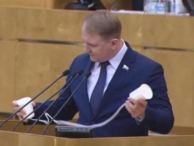 Депутат Госдумы Александр Шерин решил подарить разработчикам законопроекта о суверенном интернете детский телефон из стаканчиков. Законопроект принят в первом чтении 12 февраля. «Подарок» депутат продемонстрировал при обсуждении документа, назвав игрушку самой безопасной системой связи.
