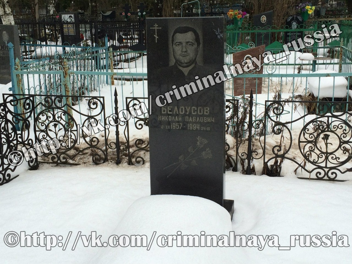 Надгробие криминального авторитета, лидера преступной группировки из подмосковного города Хотьково - Николая Белоусова (Палыч). Расстрелян со своими приближенными у торгового центра «Альянс» в Хотьково. Фрагмент из книги Николая Модества «Москва бандитская»: «Две местные группировки никак не могли поделить сферы влияния, точнее - места торговли фальсифицированной водкой. Назначили «стрелку» около кинотеатра «Юбилейный». Одна из бригад прибыла на встречу вовремя, другая так и не явилась. Прождавшие напрасно уже праздновали победу - по правильным понятиям не явившаяся на «стрелку» сторона признает тем самым свое поражение. Победители двинулись к машинам, когда на площадь выбежали несколько человек в камуфляже, черных масках и открыли ураганный огонь из автоматов. Вечер только начинался, люди возвращались с работы, кто-то отправился на прогулку. Стрелявших это не остановило, а меткостью они, как выяснилось позже, не отличались. Кроме пятерых братков, погибших сразу, смертельное ранение
