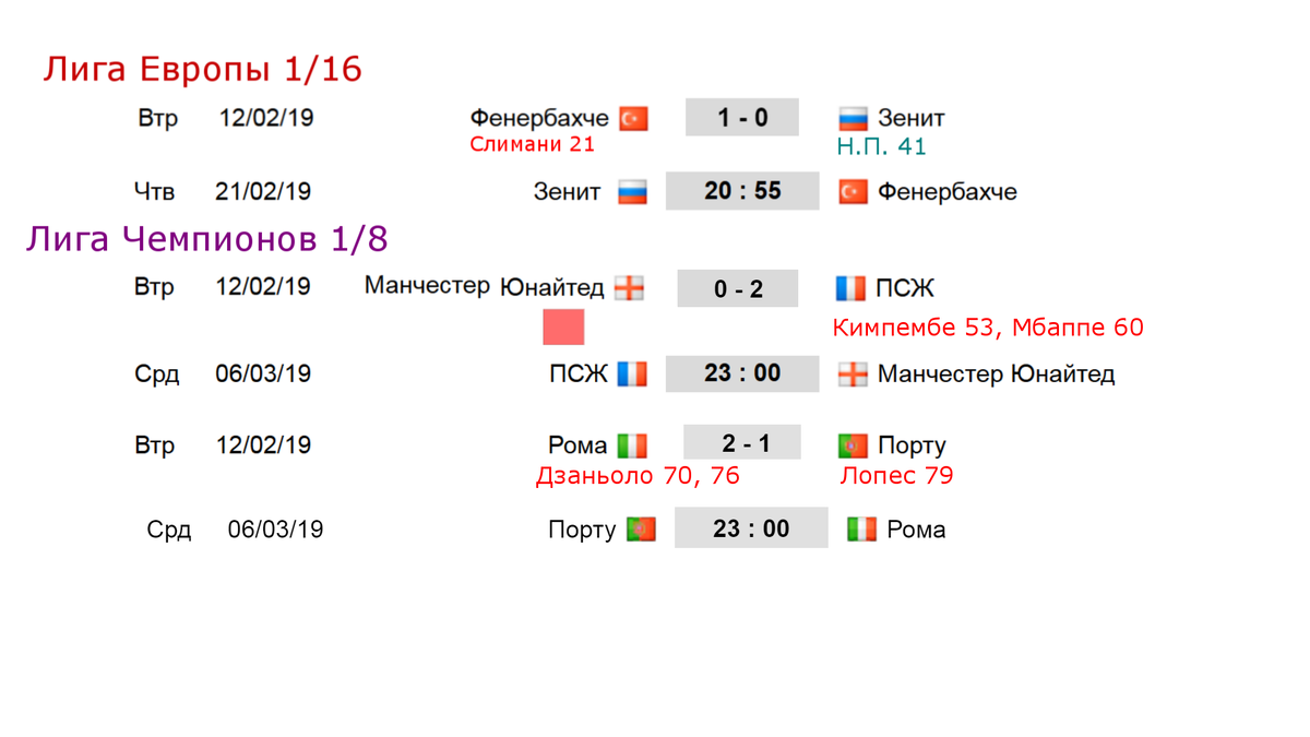 Прошло 63 дня после последнего тура в Лиге Чемпионов, наступают игры плей - офф, но начнём обзор с Лиги Европы, в этом турнире сегодня прошла одна игра 1/16. Фенербахче принимал Зенит. Как оказалось это их первое официальное свидание в истории. Переполненный «Шюкрю Сара джоглу» ревел как зверь, и турецкий коллектив сразу завелся. Зверь прижал питерцев на противоположной стороне клетки, и на 21 минуте укусил. Алжирец Ислам Слимани открыл счет. Последний его гол датируется месячной давностью. В конце тайма французский рефери, работавший на этом поединке, без колебаний поставил пенальти. Зенит его не реализовывает. Собственно в 1-м тайме у Зенита ничего не было. Надо сказать, что турецкий чемпионат продолжился после короткой зимней паузы уже в середине января, и Фенербахче за это время трижды умудрился проиграть. Зенит последние 4 игры не знает поражений, все они были товарищеские. Для клуба это был первый официальный матч в году. Теперь вы видите, что команды были в неравных услови