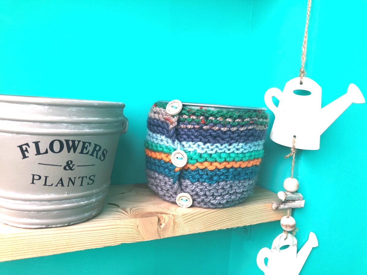 Декор цветочных горшков может быть любым. В данной статье свяжем чехол из остатков пряжи, которых у каждой рукодельницы всегда много. Цвета можно подобрать самостоятельно под интерьер или под настроение. Понадобится: остатки пряжи разных цветов, но одинаковой толщины 20 г. спицы под пряжу круговые 30 см, 4 мм крючок для закрепления нитей ведерко железное из IKEA (ширина 9 см, обхват 33 см) 3 декоративные пуговицы, иголка и нитка, чтобы их пришить Основа вязания Набираем на круговые спицы 50 петель, из которых 2 — кромочные. Вяжем платочной вязкой 1 ряд. Зеленая пряжа. Снять кромочную, все петли лицевыми. Последнюю кромочную — изнаночной 2 ряд (изнаночный) — все петли лицевыми (кроме кромочных) 3 ряд. Меняем нить на бежевую. Учитывая, что ведерко имеет не ровную форму, а расширяется кверху, нужно прибавить несколько петель. Снимаем кромочную, 5 лицевых, затем прибавить одну петлю (можно сделать накид или провязать лицевую петлю из протяжки петли предыдущего ряда). Остальные пет