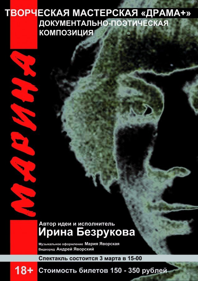 3 марта в 15.00 2019 года творческая мастерская «Драма+» представит в большом зале ЦК «Рекорд» документально-поэтическую композицию «Марина». Трагическая судьба Марины Цветаевой волнует людей до сих пор. Прожив крайне мало, она сумела донести самое главное - жизнь есть любовь… В программе использованы документы той поры и воспоминания современников поэтессы. Автор идеи и исполнитель - лауреат фестиваля имени Евгения Евстигнеева Ирина Безрукова.