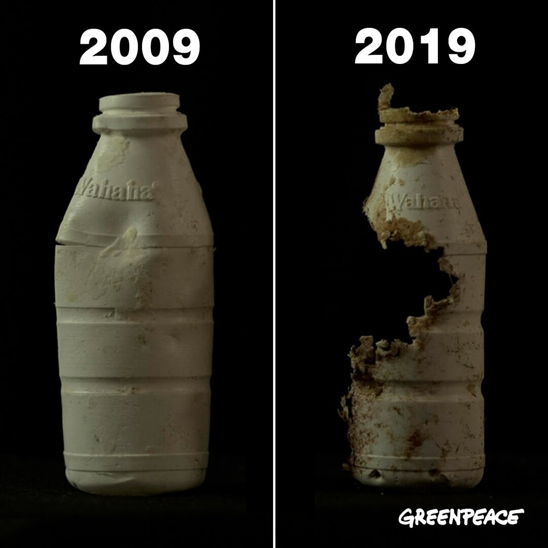 Пластиковые бутылки, которые выбросили 10 лет назад, до сих пор где-то существуют. Конкретно эту выловили в северной части Тихого океана. В природе пластик распадается на частицы, которые загрязняют почву, воду и становятся причиной гибели животных. 10 лет назад мы слышали: «Выбрасывайте мусор в урну, а не на газон». Настало время уйти от вопроса «что делать с мусором» и спросить себя «как сделать так, чтобы мусор не появлялся». Правильный ответ один — осознанное потребление и отказ от одноразового пластика.