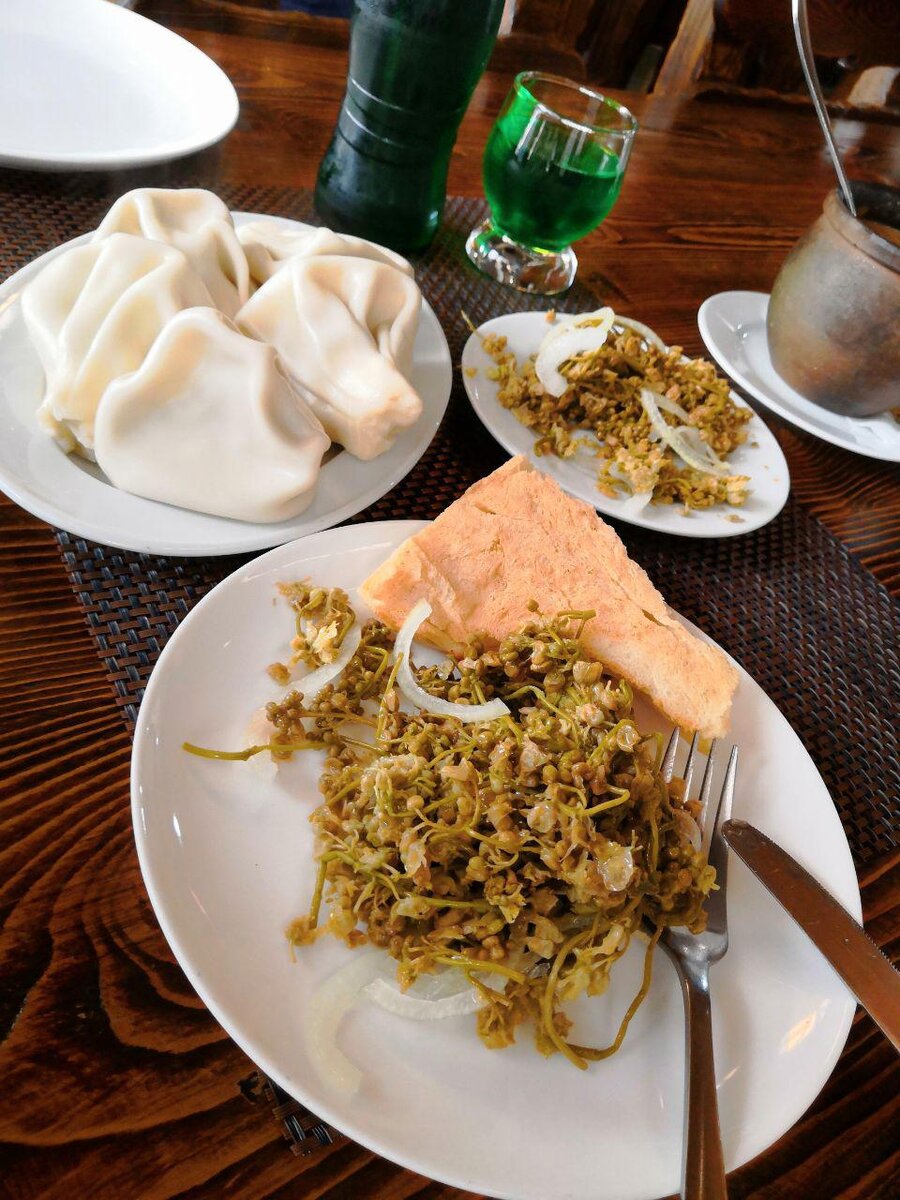 Выйдя из дворов тбилисского района Глдани, я задумался о принятии пищи материальной. Вспомнив о приятном ресторанчике у метро театр Ахметели, двинулся в его направлении. По пути мне встретилось большое количество кондитерских и пекарен — такое впечатление, что для жителей Глдани основным деликатесом являются огромные торты, которые выпекают в этих заведениях. На вид очень красивые, разнообразно украшенные. Цена за килограмм такого красавца составляет 10 лари (250 рублей, 3,3€). Наверное вкусно, но это не еда для мужчин, поэтому упорно двигаюсь в сторону ресторана. Войдя в ресторан после долгого отсутствия в Тбилиси, стараюсь сразу взять необычное блюдо, которое в Грузии называется джонджоли — вид кустарников или небольших деревьев под названием Клекачка. Грузины соцветия этого кустарника весной собирают, солят, приправляют специями. Получается очень вкусно, и его можно использовать как и в качестве салата, так и как гарнир к мясным блюдам. Перед подачей джонджоли приправляют масл