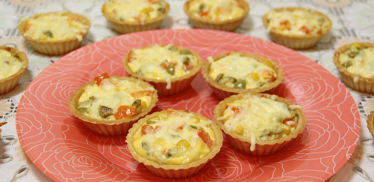Мы взяли все самые любимые ингредиенты. Как закуска это класс! Рецепт: Ингредиенты: Тарталетки (у нас получилось 14 шт.), помидоры - 3 шт, сыр - 150 гр., кукуруза - 150 гр., оливки - 150 гр., яйцо - 1 шт., майонез - 2 ст.л., по желанию можно добавить специи. Приготовление: Режем кубиками оливки, режем кубиками помидоры, сыр трем на крупной терке. Взбиваем яйцо с майонезом. Добавляем туда оливки, помидоры, кукурузу и половину сыра. Перемешиваем. Раскладываем получившуюся массу в тарталетки, посыпаем сверху оставшимся сыром. Далее отправляем в духовку на 20 минут при температуре 180 градусов. Приятного аппетита!