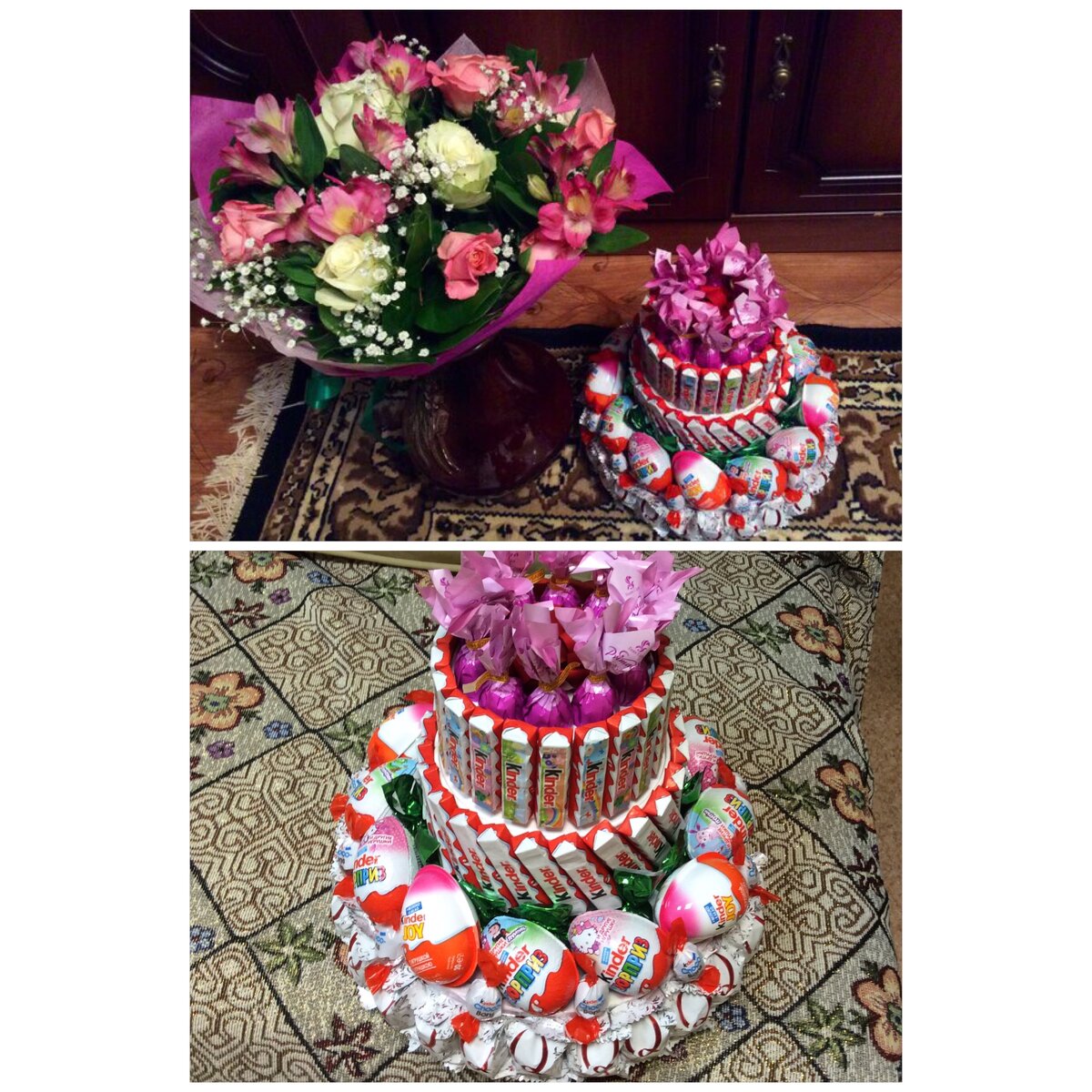 Здесь собрано 5 разных идей подарков, под разный бюджет и темперамент дарящего. Эти идеи благополучно мною проверены, реализованы и призваны помочь вам определиться с подарком. Естественно, вы можете "докрутить", видоизменить, как говорится, "на свой вкус и цвет" все представленные идеи подарков. 1. Торт из киндеров подробное описание здесь бюджет: около 2000руб + букет цветов временные затраты: Надо сходить в магазин, купить все неободимые конфеты, шоколадки, яйца, коробки. Дома все это склеить. У меня на все ушел вечер с заходом на ночь! Конечно вместо киндеров могут быть любые красивые конфеты. Дополнительно букет цветов, тоже на ваше усмотрение. Такой торт сам по себе достаточно самостоятельный подарок Подробное описание торта из киндеров читайте у меня в статье Как я клеил торт из киндеров с дополнительными сюрпризами 2. Гитара из конфет Подробное описание здесь бюджет: около 1000р временные затраты: 1 вечер. У кого как получится. Надо вырезать из пенопласта, вырезать и прикле