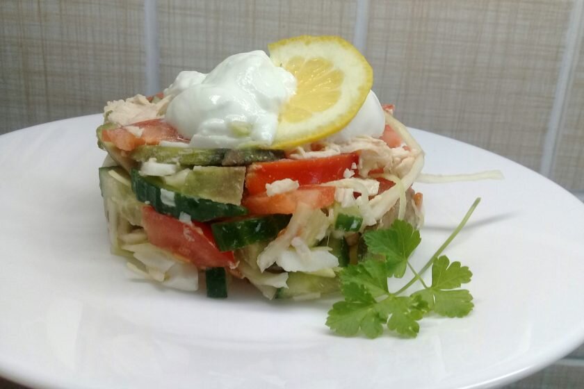 Салат с авокадо и йогуртовой заправкой это просто находка для любителей легких салатов. Несмотря на то, что авокадо обладает высокой калорийностью, не провоцирует набор лишнего веса. Поэтому салаты с содержанием этого экзотического фрукта просто обязаны быть в копилке рецептов. Ингредиенты Приготовление Куриную грудку, помидор, огурец порезать. Авокадо очистить от кожуры, убрать косточку и порезать. Яйца почистить и порезать. Капусту тонко нашинковать. Если используется белокочанная капуста и она жестковата, то после шинковки немного помять ее руками. Все порезанные ингредиенты хорошо перемешать. Далее приготовить заправку. Для этого в натуральный (лучше домашний) йогурт добавить измельченный чеснок, соль, сахар, перец, сок лимона по вкусу. Так же можно добавить зелени. Соус хорошо вымешать. Салат заправить перед подачей.