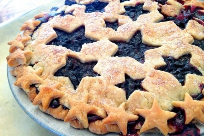 1. Звездный пирог. Это самый простой и самый популярный вариант. Из полотна теста формочками разной величины вырезать звездочки, звездочками помельче украсить край пирога. Звездочки на край приклеить взбитым белком. Верх пирога смазать кулинарной кистью растопленным маслом, посыпать сахаром, корицей, если это пирог с ягодой или с фруктами. Мясной или овощной пирог смазать желтком, смешанным с одной столовой ложкой молока или воды. 2. Пирог с косичкой. Нарезать тесто на полоски, заплести косичку, приклеить взбитым белком на край формы будущего пирога