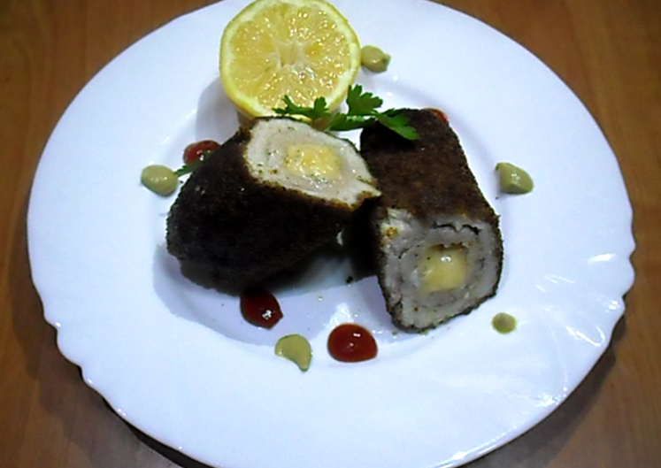 1. Вырезку нарезаем на куски толщиной около сантиметра. Отбиваем их, солим, перчим и смазываем размягченным при комнатной температуре маслом. Сверху на каждый подготовленный кусок мяса выкладываем по крупному брусочку сыра и сворачиваем рулетом, загибая края, чтобы весь сыр был закрыт. Полученные котлеты скалываем зубочистками (для фиксации формы) и отправляем в холодильник на 5-10 минут.