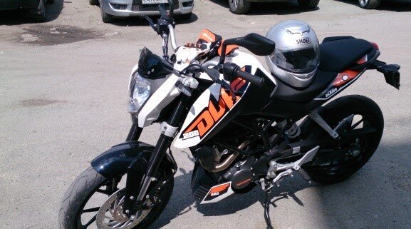 Как и многие недавно начавшие кататься мотоциклисты, я в качестве первого мотоцикла купил KTM Duke 200 ABS. Это был теперь уже далёкий 2013 год... Пока память держит впечатления, хотелось бы ими поделиться для тех, кто делает свой выбор. Сейчас, после десятков тысяч километров и опыта владения разными мотоциклами с кубатурой до 1200 и мощностью до 150 л.с. австрийский индус, конечно видится совсем по другому. Тогда, после учебного Ёбрика, это была сказка! Вилка не подламывалась в поворотах, передачи переключались гораздо более чётко, да и дурь в моторе хоть какая-то, но была. Это сейчас я понимаю, что у сиденья мелко-дюка практически нет набивки, и подвеска под моими "95 кг после обеда" пробивается на раз-два. А тогда я просто тормозил заранее и распускал тормоза, и привставал перед лежачками, и был вполне счастлив. Огорчало отвратительное качество пластиков - мягкие корпуса зеркал, например, совершенно не защищают стеклянный элемент. Зимой перемёрз красивый, похожий на кровь Чужого