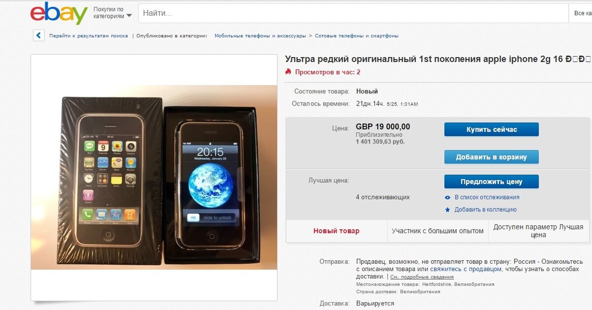 На популярнейшем в мире интернет-аукционе Ebay iPhone 2G продают около десятка человек. В зависимости от страны стоит первый смартфон Apple от 400 тысяч до 1 миллиона рублей — в 5-10 раз дороже, чем последние модели. Самый же дорогой iPhone предлагает пользователь из Великобритании, выставивший раритетный телефон на продажу за 19 тысяч фунтов стерлингов (около 1,4 млн рублей). Правда, покупателей, даже потенциальных, пока не нашлось. На авито же ценник немного ниже и колеблется от 100 т.р. А вы бы хотели иметь такой раритет?