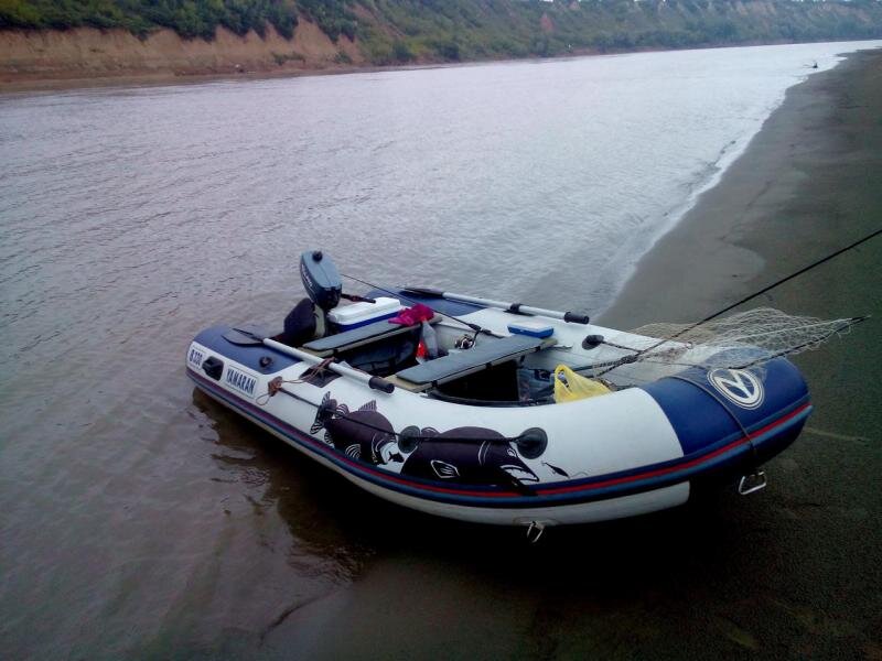 Рассказываю о своей, бывшей Купил лодку у знакомого. Было ей уже - лет 7. Номера, нарисованные на бортах - так и не смог вывести. Поэтому - закрасил их. Нарисовал зубастых, упитанных рыб. Пусть привлекают щуку и судака. Прокатился на моём стареньком SiaPrо 2,5 л.с. (само собой - вообще никак не едет). Потом поставил взятую напрокат Yamaha 8 (с гидрокрылом из лопаты)) ) Лодка тяжелая. С восьмёркой - шустро выскакивает на глисс (два лёгких седока). Но дальше - особо то и не едет. Просит мотора чуть мощнее. Курсовая устойчивость - отличная. Брызги в кокпит не летят. Ну, разве что - на приличной волне - когда и рыбачить то уже, не интересно. Лучше дома сидеть. Но это всё я оценил уже позже, когда поставил более мощный мотор - 9.9 (который в реальности 15л.с.). Сливной клапан пришлось лечить. От времени он развалился и немного пропускал воду - под слань Отремонтировал его и посадил на герметик. Сделал из зимнего рыб.ящика - столик для эхолота И купил удобный держатель датчика Купил и п