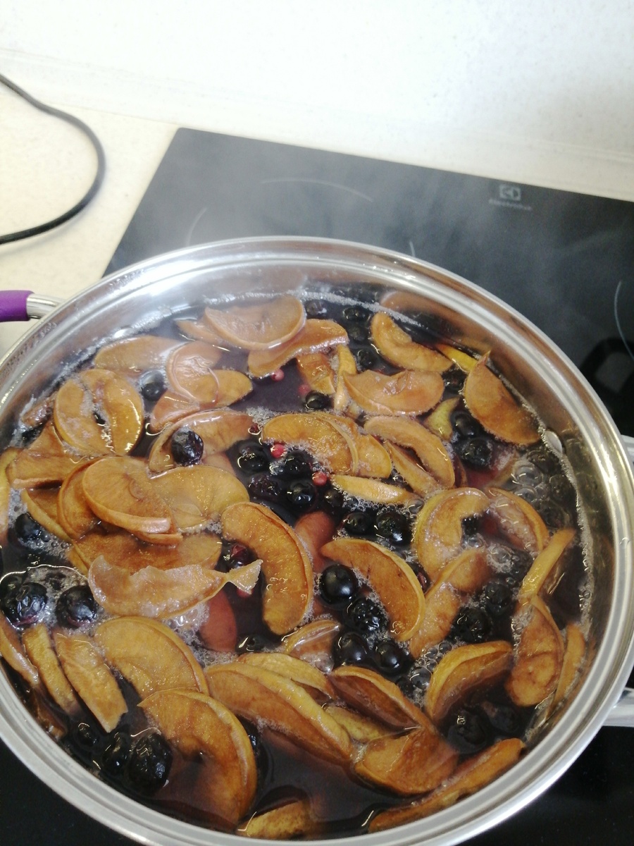 Добрый день! Сегодня расскажу Вам, как я готовлю компот. Холодными зимними днями горяченький компот разлетается только так. Водный баланс в организме должен поддерживаться всегда. А зимний период, как мы все знаем, период вирусных заболеваний. А в периоды заболеваний как детям, так и взрослым необходимо большое количество жидкости и витаминов. С жидкостью из организма выходят токсины, отходы, которые образуются в процессе борьбы организма с инфекциями и вирусами. Компот сварить очень просто и быстро! Вам понадобится: -Сушеные яблоки (можно свежие яблоки) – 30-35гр. - Брусника (консервированная) – 6ст.л. - Черноплодная рябина (мороженная) – 70гр. - Сахар – 3-4ст.л. (по вкусу) - Мед – 3ст.л. - Вода – 2,5 - 3л. Фрукты можно брать сушеные, мороженые или свежие. Стоит только учитывать, что если берете сушеные фрукты, то их надо дольше варить. Начинаем готовить: - Наливаем воду в кастрюлю, ставим на плиту и добавляем сушеные яблоки. - Доводим до кипения и добавляем черноплодную рябину и сах