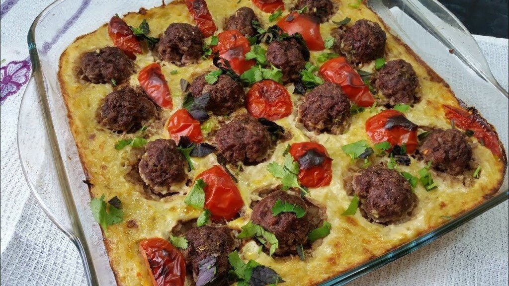 Приправить куркум. Снять с огня и дать овощам немного остыть. 5. Сырой картофель почистить и натереть на терке. 6. Укроп промыть, обсушить и мелко нарезать. 7. Смешать тертый картофель с майонезом, добавить горчицу, манку, яйца, соль и перец по вкусу. А также нарезанный укроп. Тщательно перемешать. 8. Добавить к картофельной смеси обжарку. 9. Форму для запекания смазать растительным маслом. 10. Из мясного фарша сделать шарики размером с грецкий орех