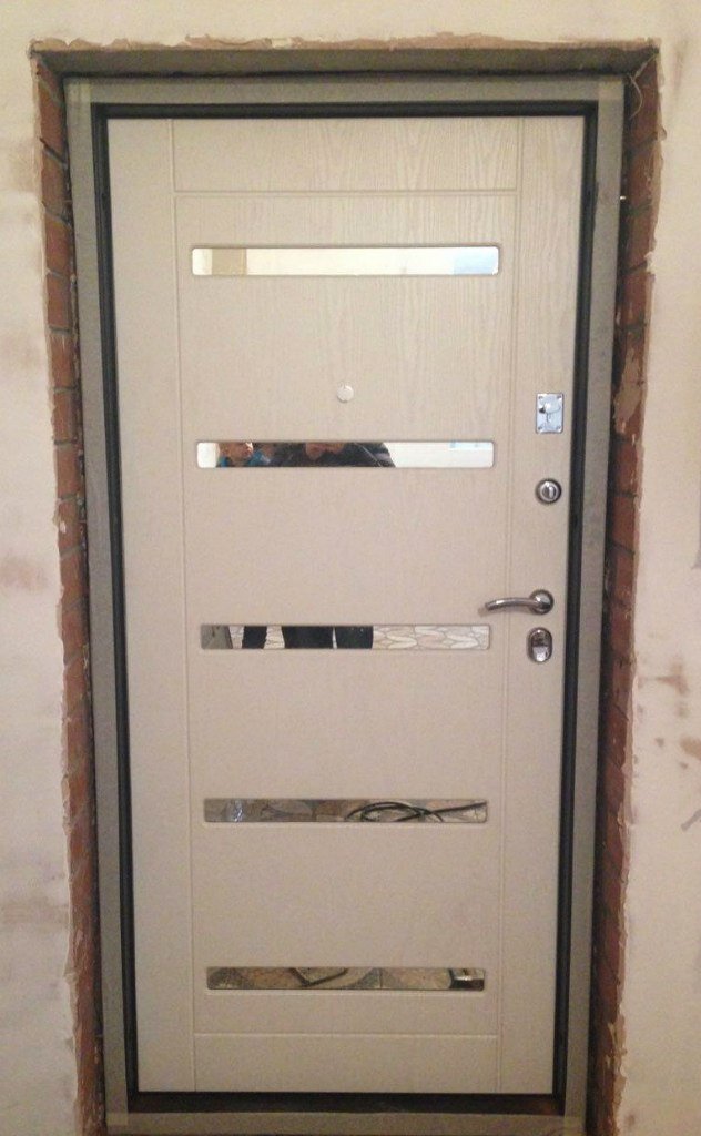 Некоторые производители делают "сборные" двери, начинку которых можно собрать как конструктор. В таком случае цена за внутреннюю МДФ панель, замки, ручку и глазок может быть не фиксированной и просчитываться дополнительно. Вам может понадобится облагораживание или, как его часто называют, "откосы". Когда дверь встает в проем, то со стороны квартиры видно запенку и прочие моменты монтажа (смотрите на прикрепленную фотографию). Более изящный вид можно придать облагораживанием - обрамлением проема доборными элементами в цвет внутренней панели. Эта услуга предлагается отдельно, стоимость складывается из материала, который подбирается индивидуально и замера проема.