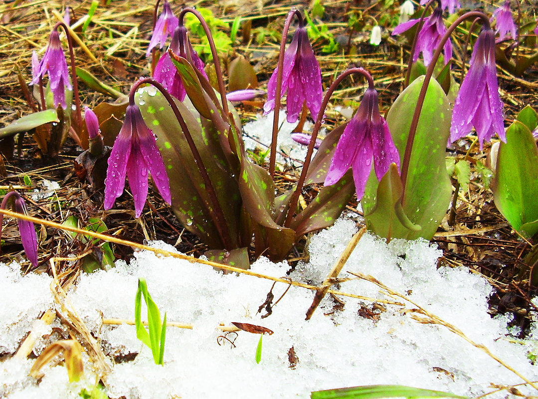 Белоснежными подснежниками вряд ли кого удивишь, хотя они и вызывают восторг и умиление. Зато ярки-лиловые или розовые цветочки этого растения, распускающиеся на проталинах или даже пробивающие снег навстречу робкому весеннему солнцу, точно не останутся незамеченными! Это кандык, или эритрониум (Erythronium). Другие его названия – собачий клык и даже волчий клык. По виду нежный и хрупкий, но без проблем переносит и снегопады, и сильные заморозки. Почему такое необычное название? Из-за формы луковиц. Они в диаметре всего 1 см, зато в высоту 3–8 см, причём с небольшим сужением к донцу и к верхушке. И поэтому очень похожи на собачий или волчий зуб, а точнее клык! В средней полосе без укрытия зимуют кандык европейский и кандык сибирский. Так что ищите в продаже именно их. И на цвет обращайте внимание, если хотите яркости. Кандыки бывают не только в розово-лиловой гамме, но и жёлтые, белые. В садовых центрах и магазинах вы эритрониум пока не встретите (редкость!), но в продаже растение точн