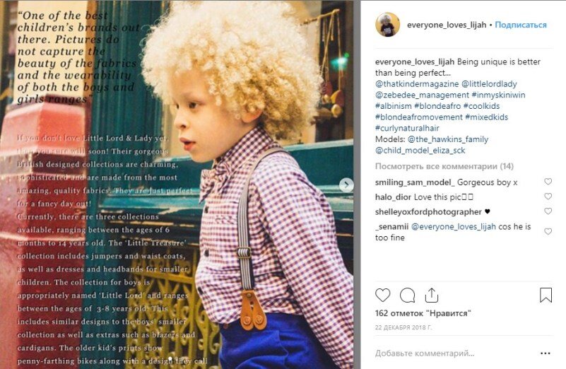 «Вот, это удача!» — пишут многие комментаторы в сети. В Великобритании мальчика-альбиноса, возрастом 5 лет, сделали лицом детской коллекции модного ирландского бренда одежды «Primark». Это произошло благодаря фотографии, которую опубликовала его мать на фейсбуке. Издание Metro не смогли пропустить историю и рассказали на своих страницах. Возможно, мальчику повезло, что снимок заметили, но его внешность действительно интересна. Его имя Алия Энверем, живет ребенок в городке Уилленхолл (графство Уэст-Мидлендс). Его нестандартная внешность привлекала к себе внимание. Малыш — альбинос. Кроме того у него пышная шевелюра кучерявых волос и белая кожа. Ребенок никогда не понимал, что заставляло людей тыкать на него пальцем, провожать взглядом и почему он не похож на родных братьев и сестер. Но еще в 2017 году, его мать Люси Дауэс все изменил. Пользователи тут же стали пророчить крохе модельное будущее. Семья и раньше слышала подобные высказывания, получала советы по агентствам и фотографам. Е