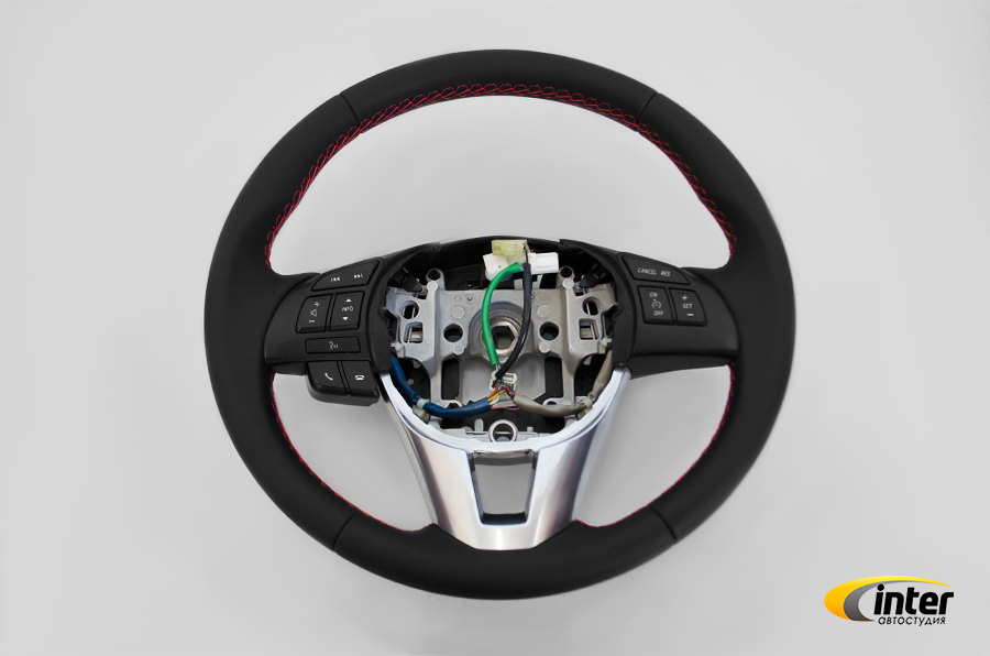 Сшили и установили оплетку на руль. Для производства использовалась искусственная кожа Швайцер Наппа (Германия) .