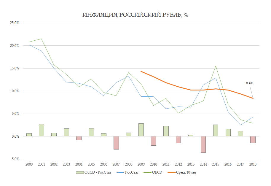 За 2018 год #инфляция в РФ составила 4.3% по данным #Росстат и 2.9% по данным #OECD (тот редкий случай, когда зарубежные данные о #Россия лучше 😊). Средний уровень инфляции в России за последние 10 лет составляет 8.4% в год. Это значит, что накопления в рублях обесцениваются в 2 раза каждые 100 / 8.4 ~ 12 лет. Для сравнения. Средний уровень инфляции в #США за последние 10 лет составляет 2%. Американские доллары обесцениваются в два раза примерно каждые 50 лет. В #Европа – 1.6% и примерно 62.5 года соответственно.