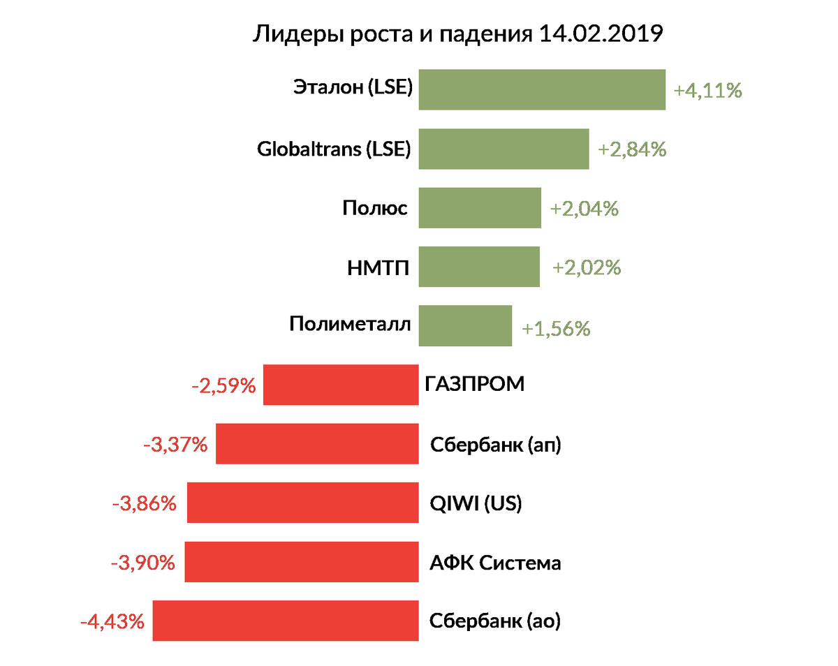 Лидерами роста стали: Эталон (LSE) (+4,11%), Globaltrans (LSE) (+2,84%), Полюс (+2,04%), НМТП (+2,02%), Полиметалл (+1,56%).