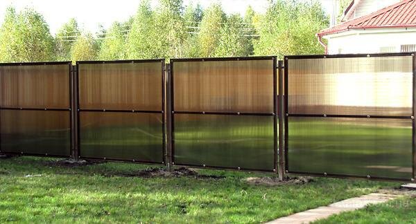 Поликарбонат — практически универсальный стройматериал, который широко используется в строительстве, сельском хозяйстве, в промышленности, и даже является непременным атрибутом для декорирования помещений. Синтетический полимер обладает такими свойствами, как огнестойкость, ударопрочность, устойчивость к перепадам температур. Он не боится влаги и сильного ветра, которые могут стать опасными для металлических и деревянных конструкций. Наверняка вы замечали красивые и оригинальные заборы из поликарбоната, ограждающие территорию вокруг коттеджей или учреждений массовой культуры. Материал выбран не случайно, ведь он отличается низкой ценой и высокими эксплуатационными характеристиками. Вам не потребуется ухаживать за поликарбонатом, нет нужды и в финишной отделке. Если монтаж произведен правильно, такой забор станет прекрасной защитой вашего дома и украшением территории. Ограждение очень интересно и оригинально внешне — широкий выбор цветов позволяет создать идеальный забор, соответствующ