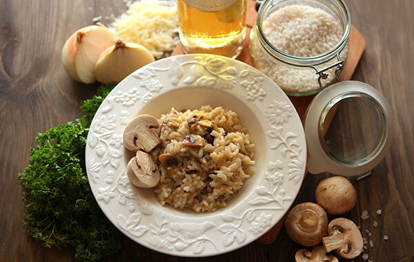 ИНГРЕДИЕНТЫ Рис для ризотто - 150 г Свежие грибы - 100 г Оливковое масло - 20 мл Белое сухое вино - 500 мл Сливочное масло Лук-шалот - 2-3 штуки Чеснок ИНСТРУКЦИЯ 1. Разогрейте оливковое масло в кастрюле и добавьте чеснок, лук-шалот. Обжарьте несколько минут ингредиенты. Можете приправить специями по вкусу. 2. Добавьте рис, снова налейте оливковое масло и белого вина. Тушите до готовности. 3. В тоже время обжарьте нарезанные грибы на оливковом или сливочном масле до готовности. 4. В кастрюлю с ризотто добавьте небольшое количество воды и доведите до готовности. Добавьте грибы и готовьте еще минут 10. 5. После приготовления дайте постоять несколько минут. Можете добавить тёртый пармезан или жирные сливки, перемешать и подавать к столу. Украсить зеленью. Приятного аппетита! P.S. Буду благодарна Вам за лайк, если статья понравилась или вы что-то почерпнули нового) Спасибо!)