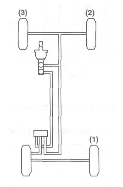 Схема прокачки тормозов Портер Тормозная гидравлическая система должна быть прокачана всякий раз после снятия тормозной трубки, тормозного шланга, главного цилиндра, колесного тормозного цилиндра или когда при нажатии педаль недостаточно жестка.Прокачка тормозной системы осуществляется в последовательности, указанной на рисунке. ВНИМАНИЕ 1. Используйте тормозную жидкость, соответствующую спецификации. Не используйте смесь рекомендуемой тормозной жидкости и жидкости другой марки. 2. Если тормозная жидкость подвергается воздействию воздуха, она начинает впитывать влагу; в связи с поглощением влаги из атмосферы, точка кипения тормозной жидкости понижается, что оказывает серьезное влияние на свойства жидкости. По этой причине используйте герметично закрывающиеся фляги 1 литр (1.06 кварты США, 0.88 кварты) или 0.5 литра (0.52 кварты США, 0.44 кварты) для тормозной жидкости. Все запчасти в нали