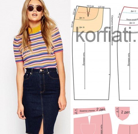 Такая джинсовая юбка карандаш – базовая модель практически любого женского гардероба. У юбки очень правильная длина и зауженный книзу силуэт, который не только визуально вытягивает нижнюю часть фигуры, но и маскирует все недостатки. С моделированием выкройки придется повозиться, но не из-за сложности процесса, а из наличия большого количества деталей. Зато результат того стоит! Выкройка джинсовой юбки моделируется по базовой выкройки юбки. Вы можете скачать на сайте готовую базовую выкройку юбки на 5 стандартных размеров бесплатно! Выкройка джинсовой юбки