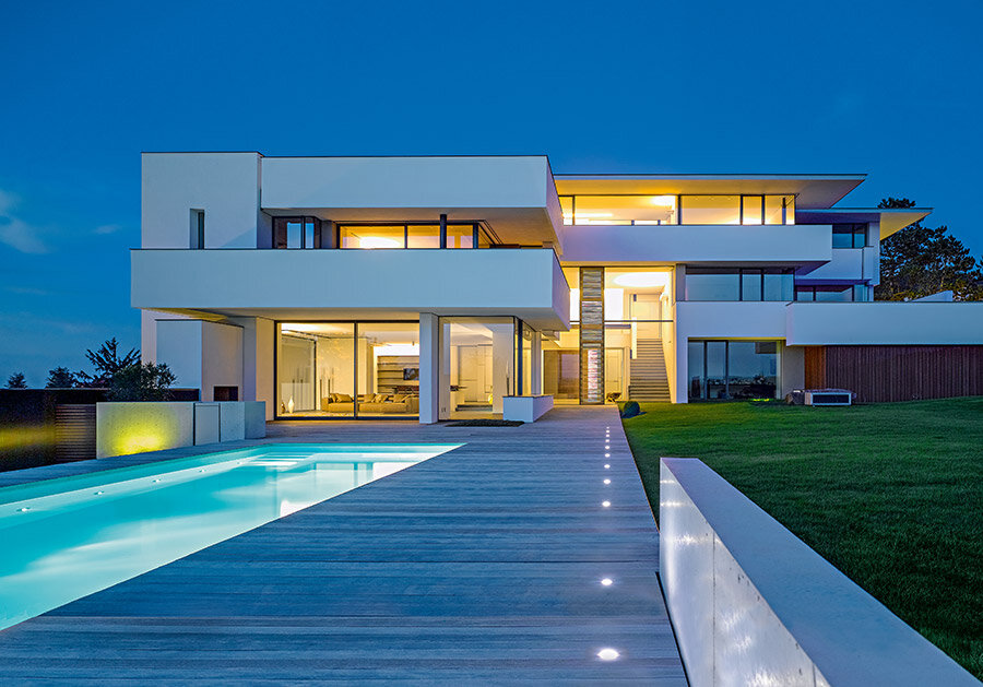 Автор проекта: архитектор Александр Бреннер (Alexander Brenner), г. Штутгарт Элегантная белая вилла появилась в окрестностях Штутгарта сравнительно недавно. Расположенная в городской черте, она раскрывает перед своими владельцами преимущества жизни на лоне природы. Красивое здание с тремя надземными и одним подземным этажом производит впечатление солидного, основательного, возведенного на века строения. Местоположение участка — уникальное для условий Штутгарта: холм с обзором на три стороны, открывающим великолепные пейзажи с виноградниками, лесом и видом на город. Учитывая особые требования к застройке и пожелания заказчиков, архитектор Александр Бреннер спроектировал экстравагантную виллу, которую по праву можно назвать современной жилой скульптурой: здание гармоничных пропорций предстает перед зрителем как скульптурная композиция из кубических объемов, больших плоскостей стен и крыш и панорамного остекления. Выразительная графика оконных переплетов и тщательная проработка входной