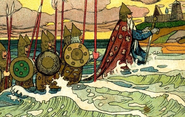 Для «Царя Салтана» Пушкин использовал народную сказку, в которой младшая сестра похвалилась, что с первого раза родила бы царю 33 сына. Царь женился на ней, и через девять месяцев она родила 33 мальчика, а 34-й («иной») уродился чудом – ножки серебряные, ручки золотые, во лбу звезда, в заволоке «месяц». Дальше у этого иного царевича было уже 30 братьев, а не 33. Этот сюжет используется уже в «Руслане и Людмиле»: