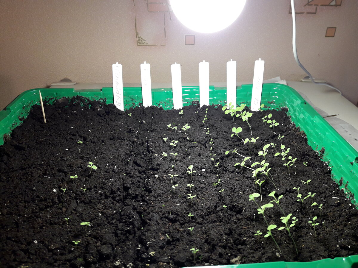 В первой части я рассказал как сеять семена петунии. После посева поставил лоток с сеянцами в тёплое место под хорошую лампу. Сейчас появились мощные светодиодные лампы, которые хорошо светят и не слишком сильно нагревают. Использовать следует лампы с нейтральным или холодным светом ближе к голубому спектру. Я использую нейтральные мощностью 20-22Вт, что примерно соответствует 160-180Вт ламп накаливания: Накрыл прозрачным колпаком. Каждый день поливал шприцом каждую семечку. Как обычно, проклюнулись семена разных сортов по-разному. О чём это говорит? Прежде всего это говорит о том, что семена в магазине хранились не надлежащим образом, и те семена, что висели на полке с осени и к весне потеряли всхожесть. Это значит, что правильно регулярно покупать в магазине нужные семена уже с осени, как только появляются на прилавке, и хранить их у себя в холодильнике, как и полагается. Как бы то ни было, видим, что спустя всего две с половиной недели ампельный сорт выдал два настоящих листика и